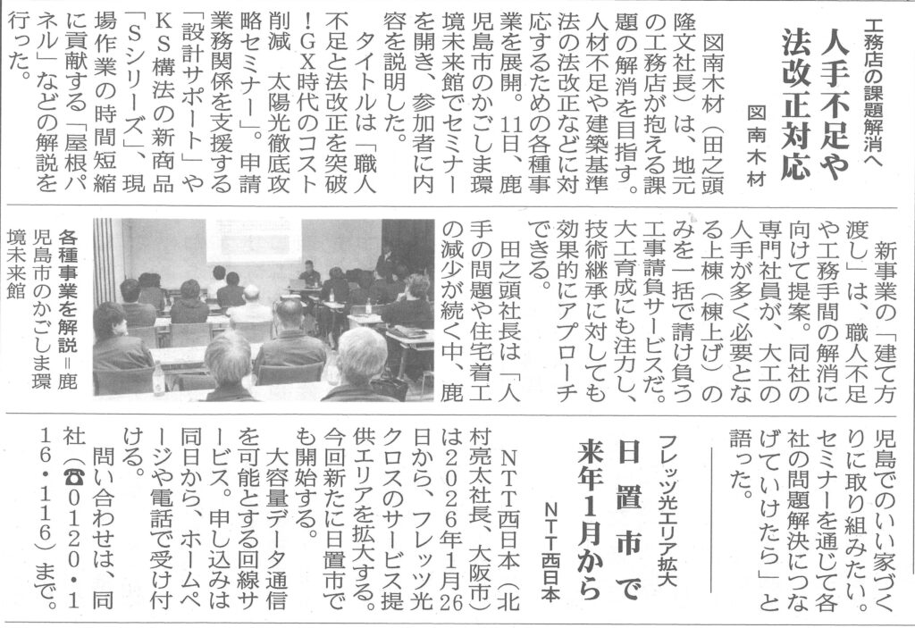 2025年11月15日発刊の鹿児島建設新聞にて、図南木材株式会社が主催した「GX時代のコスト削減 太陽光徹底攻略セミナー」の様子が紹介されました。
